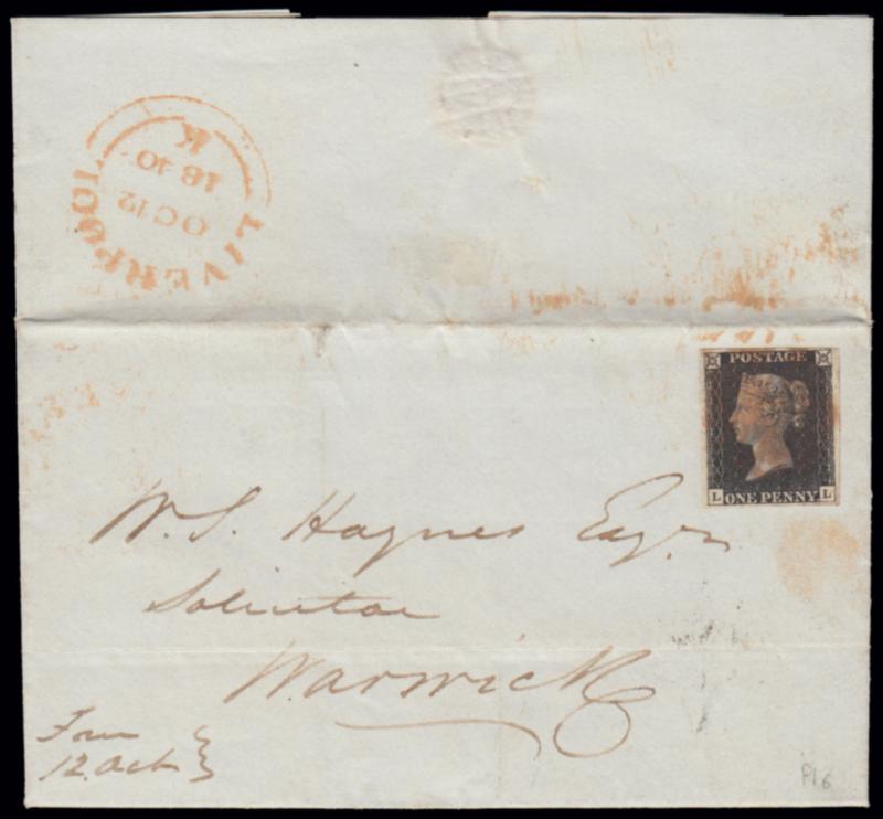 Q.VICTORIA 1d.. Plate 6, letters LL, on written cover from Liverpool to Warwick dated Oct 12 1840 with Liverpool orange Maltese Cross and city date stamp in matching orange cancellation, 4 good margins (SG. 1). (Image)