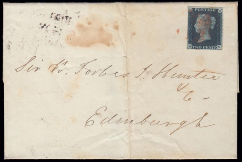 Q.VICTORIA 2d.. Plate 1, Letters MG, used on cover from Glasgow to Edimburgh 1841 cancelled with Red Maltese cross, 4 white margins. (Image)