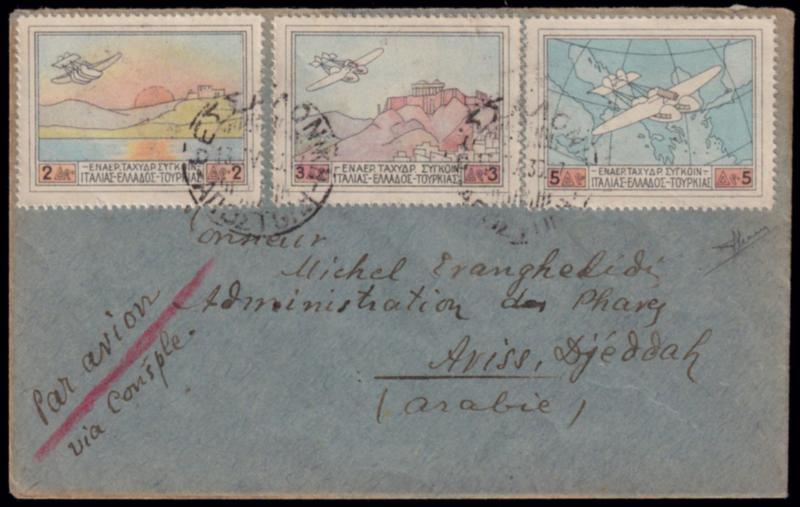 AEROESPRESSO DEL LEVANTE. Aerogramma spedito da Salonicco via Costantinopoli per Djeddah in data 13/4/33 ed affrancato con la serie di 4 francobolli di posta aerea di Grecia. Timbri di transito e arrivo. Firmata Sorani. (Image)