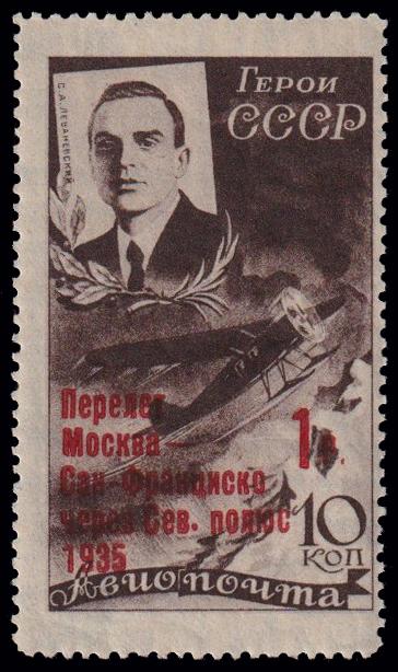 1935 VOLO MOSCA - SAN FRANCICSCO. Francobollo di posta aerea da 1r. su 10k. soprastampato in rosso per commemorare il volo transpolare. (Image)