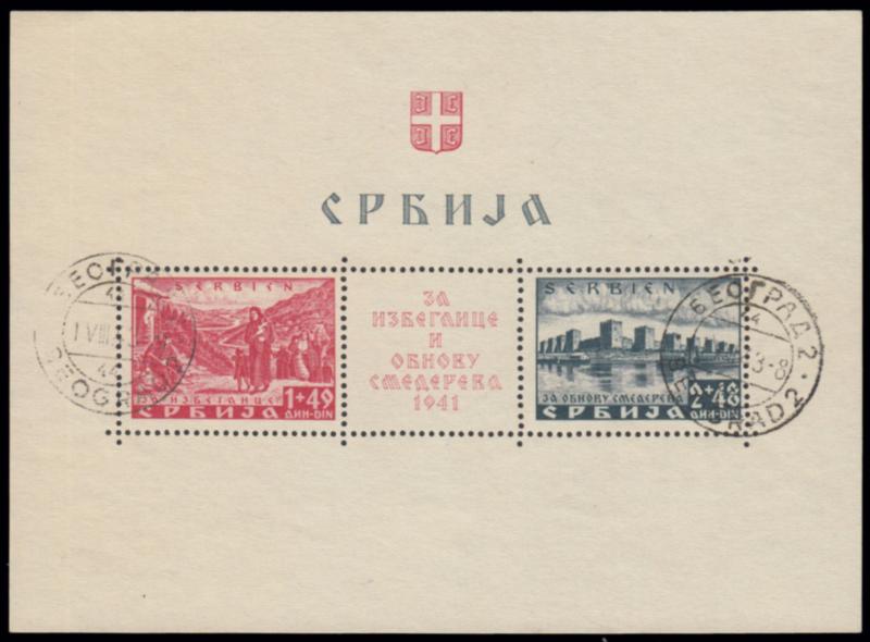 1941 GERMAN OCCUPATION - SEMENDRIA. Both souvenir sheets (perforated and imperforated) cancelled, "Beograd 2 1/8/43" (Michel Bl 1+ 2). Signed Diena. (Image)