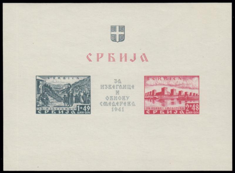1941 GERMAN OCCUPATION - SEMENDRIA. Both souvenir sheets (perforated and imperforated) unused with original gum (Michel Bl 1+ 2). The unperforated with Kleyman certificate (2012). (Image)