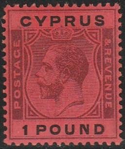 Cipro. 1923 - Effigie di Giorgi VI £ 1 violetto e nero su roso n. 83. Cert. Chiavarello. Cat. € 2900,00. SPL (Image)