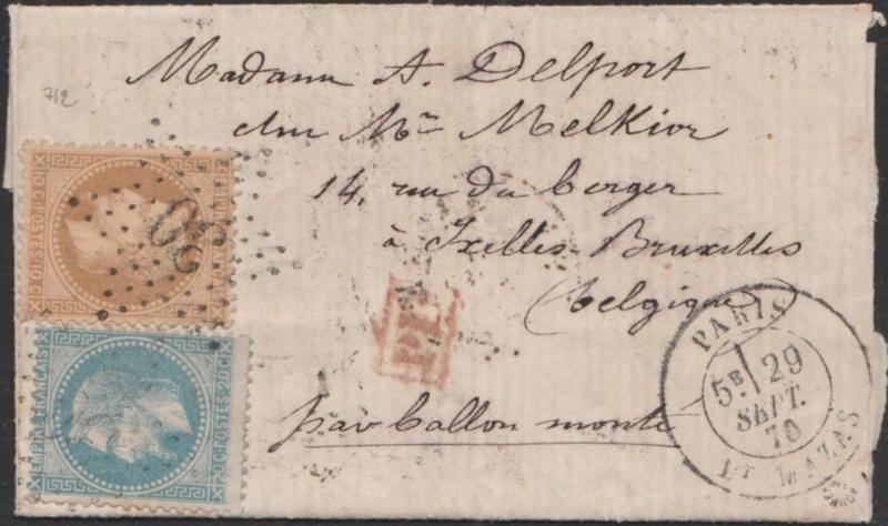 Ballon Montè. 29/09/1970 - Lettera da Parigi per Bruxelles, affrancata con Napoleone laureato 10 c. e 20 c. Al verso annulli di transito e arrivo. Cert. Roumet. SPL (Image)