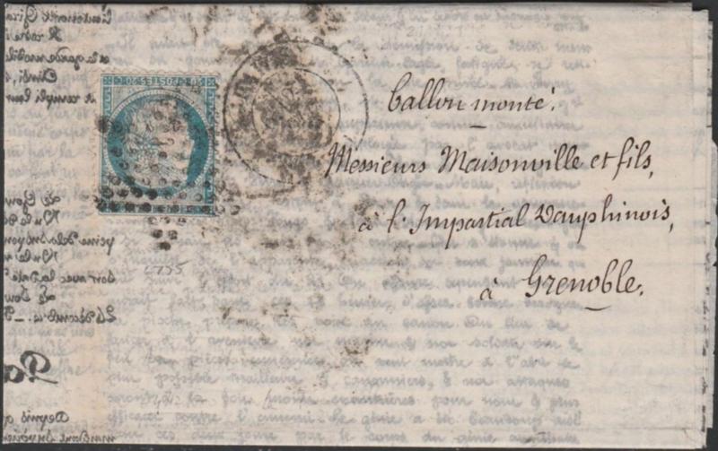 Ballon Montè. Corrispondenza dell’Agenzia di stampa “Havas” per Grenoble, affrancata con 20 c. assedio di Parigi, annullato a stella ed il cachet del bureau centrale. Le “TOURVILE” partì il 4 dicembre, con annullo di arrivo a Grenoble. Cert. Ceres. SPL (Image)