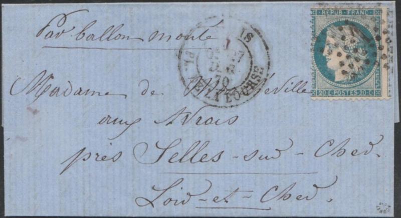 Ballon Montè. 29.12.1870 - Lettera da Parigi diretta a Selles-S-Cher, affrancata con 20 c. Napoleone laureato. Al verso annullo di arrivo (Image)