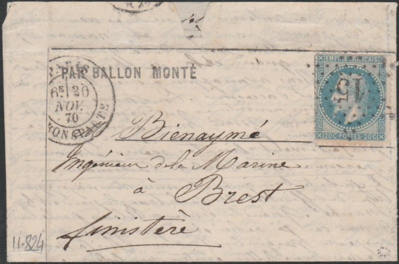 Ballon Montè. 30.11.1870 - Lettera da Parigi diretta a Brest, affrancata con 20 c. Napoleone laureato. Al verso annullo di arrivo. SPL (Image)