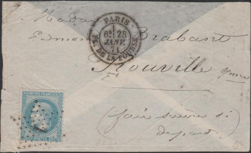 Ballon Montè. 28.01.1871 - Lettera da Parigi diretta a Rouville, affrancata con 20 c. Napoleone laureato. Al verso annullo di arrivo. La lettera non presenta il lembo di chiusura. SPL (Image)