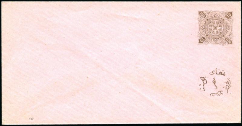 1865 Prevost Essay, 10 paras vignette and overprint printed separately, on pink envelope, diagonal bend, fine. (Image)
