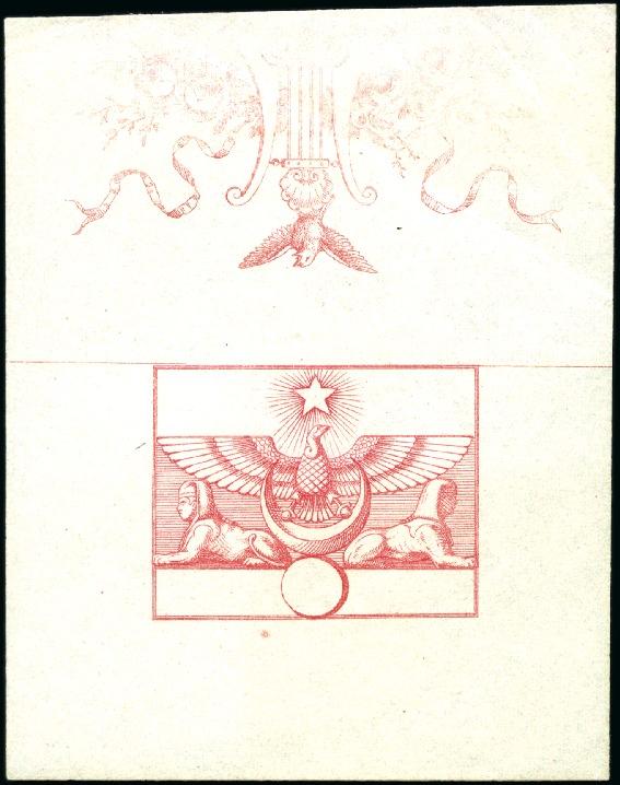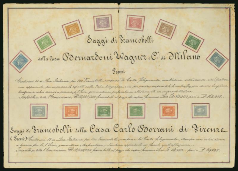 1874 Essay of Carlo Borani and Bernardi Wagner & Co: Presentation sheet showing top part with Carlo Borani essays comprising of three 20pa Sphinx at left of Pyramids and three 1pi Sphinx at right of Pyramids; the lower part with Bernardoni Wagner essays comprising eight 20 paras Sphinx in front of three Pyramids, all essays in an array of colours, mounted on large official document with price details, an extraordinary and unique presentation sheet; ex The Royal Collection (NP E61, $8'500). (Image)