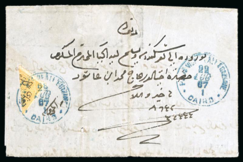 2pi Yellow-orange, perforation 12½, bisected single, tied on 1867 (22.7) folded letter sheet from Cairo to Alexandria, by POSTE VICE-REALI EGIZIANE / CAIRO /22.LUG.67 cds in blue, similar alongside, arrival bs, central cvr crease, and small tear, very fine and an attractive bisected usage; ex Rudi Jeidel. (Image)