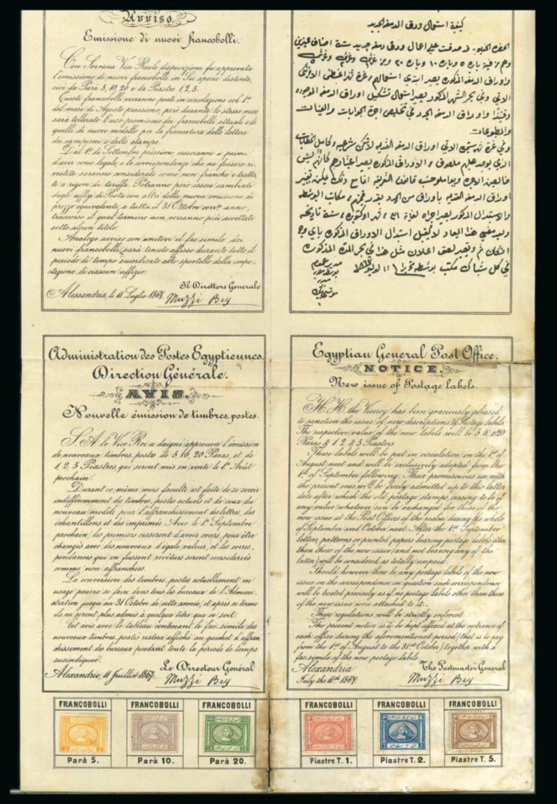 Postal Notice announcing the arrival of the 1867 issue, dated "July the 11th 1867". This original notice shows instruction to the Postmasters in Italian, French, Arabic, and English, bearing a complete set of all six values affixed at the base and another fine mint set on an exhibition page. As to be expected there are creases and a few stains to the Notice.