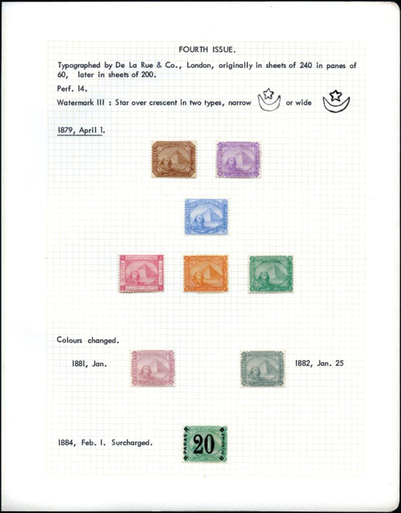 ABE TO ZEFTA: Specialized and extensive collection neatly presented on 267 pages including extensive maps and collateral information. The strength of this collection is in the vast array of different town cancels, types and usage on stamps, fragments, covers, interpostal seals, postal receipts, plus some early stampless Official covers, plus the items from the Mohammed Ali Post all with negative seals etc. The collection is neatly presented in alphabetical order and the town cancels are listed by Smith and are as follows: Abe el Wakf PS-4 (2, scarcity factor 2500), Abu Homus I-2.5 (5), V-2.3 (3), Seal A-4 (1), Assuan IV-6 (3), V-4 (3), Atfe I-2.5 (6), V-1 (7 + one cover), PS-1 (1), Seal A-4 (1), Benha Seal A-4 (1), I-2.5 (1, one cover), III-2.5 (3), III-2 (4), V-3.1 (1), Cas-2 (5), PS-1 (1), Benisueff II-2 (1), III-2.5 (1), III-2 (2), RES-I (1), Bilbes III-2.5 (1), III-2 (3), Birket El Sab I-2.5 (4, one cover), III-2.5 (1), III-2 (6, one cover), Cas-2 (2), PS-1 (1), Bulah Dacrav V-2.3 (1), V-2.2 (4), Cantara II-2 (2), III-2.5 (1), PS-3 (1), Chaluf El Tarabba II-2 (1), PS-3 (1), Chantier VI Tem-1 (14), Damanhour Seal A-4 (one cover), I-2.5 (4, 3 covers), III-2.5 (one cover), III-2 (1), V-1 (5, one cover), Damanhour Stazione (2, scarcity factor 3000), Damiata I-2.5 (3, 2 covers), III-2.5 (7, 3 covers), III-2 (4, 3 covers), III-4 (one cover), Cas-2 (4), PS-1 (1), Desuk II-2 (2), III_2.5 (3, one cover), III-2 (4), PS-1 (1), El-Gisr II-2 (1), PS-3 (2), El-Uasta III-2 (4), Embabe II-4 (2, scarcity factor 3000), Esna Seal A-6 (one cover), V-4 (4), Fescne Seal A-1 (1), II-2 (1), II-4 (1), SL-2 (1), III-2.5 (3), III-2 (5), Sta-6 (1, scarcity factor 3000), Galiub Seal A-4 (1), I-1 (1), III-2.5 (2), III-2 (2, one cover), PS-1 (1), Ghirgheh Seal A-1 (one cover), V-5 (9), Ghisa III-2.5 (1), III-2 (2), Godaba III-1.5 (3), III-1 (1), Helouan VI-2 (1), Ismailia I-1 (1), II-2 (1), Seal A-4 (1), III-2 (1), III-2.5 (12), III-1.5 (tête-bêche pair), V-2.2 (6), V-2.3 (6), CAS-2 (4), PS-1 (2), Sta-5 (1, scarity factor 3000), Kafer Dauar I-2.5 (1), V-1 (2), PS-1 (1), Kafer-Zayat I-2.1 (1), I-2.5 (3), III-2.5 (5), V-1 (4), V-1.5 (one cover), Cas-2 (2), Karaskon V-4 (2), Seal RA-5 (1), Kena Seal A-1 (1), V-4 (2), IV-6 (1), kil. 83 II-5 (2), Tem-1 (7), Luxor IV-6 (1), V-4 (6, two covers), Magaga III-2.5 (6), Seal A-6 (1), Sta-6 (2, scarcity factor 2500), Mahallet el Roh I-2.5 (1), II-2 (1), II-4 (1), Manfallut V-1 (3), PS-5 (2), Mansura I-2.5 (1), I-1 (7, two covers), III-2.5 (5), V-6.1 (5), V-6 (7, three covers), Cas-2 (6, one postal receipt), Mansura Statzione (2, one cover), Mellaui V-1 (2), PS-5 (1), Minet el Faium Seal R-2 (1), Minet el Faium II-2 (1), III-2.5 (3), III-2.5 (5), Faium Stazione Sta-6 (2, scarcity factor 2500), Michalla I-2.5 (1, one cover), III-2.5 (1, one cover), III-2 (1), III-3 (3), Cas-2 (7, one cover), PS-1 (2), Mehalla Stazione Sta-6 & Sta 5 (6), Minet el Gamb I-2.5 (1), III-2.5 (1), III-2 (2), PS-1 (1), Minia III-2.5 (two covers), III-2 (one cover), Mina Stazione Sta-6 (3), Minuf IV-2.5 (2, one cover), IV-2 (5, one cover), Cas-3 (1), Port Said II-2 (one cover), III-2.5 (6), III-2 (4), V-2.2 (9, one cover), V-2.3 (16), Cas-2 (1, one cover), Ramle I-2.5 (3),Ramses V-1 (2), V-1.5 (3), Seal R-2 (1), Raz El Ech Tem-1 (1), Roda III-2.5 (1), III-2 (2), VI-1 (4), Rosetta III-2.5 (2), III-2 (3), Samanud I-2.5 (3, one cover), III-2.5 (3), III-2 (4), PS-1 (1), Sta-6 (2), Scibin El Anater III-2 (3, one cover), Scibin El Com I-4 (2, two covers), PS-2 (1), V-1 (9, two covers), Scibin El Com Stazione (3, scarcity factor 2500), Scirbin IV-1 (2), Serapeum III-2.5 (4), Siut IV-2 (3, one document + one cover), IV-2.5 (3), Cas-3 (3), PS-5 (4), Sta-6 (1), Sohag V-4 (8), IV-6 (3), St. Bacos (3), St. Bulkeley (1), St. Felming (1), St. Mustafa (1), St. Schutz (3, one cover), Suez I-2.5 (8, two covers), II-2 (1, one cover), III-2.5 (7), PS-1 (1), III-4 (12, two covers), VI-2.2 (3), Cas-2 (8), Suez Stazione Sta-5 + Sta-6 (16, one cover), Tanta I-2.5 (4, two covers), III-2.5 (6), V-2.3 (1), V-1 (13 + tête-bêche block of eight), PS-1 (1), Cas-2 (4), Tanta Stazione on block of four + cover, single + cover, Teh el Barud (8), Tel El Kebir (7), Took (5), Zagazig I-2.5 (3, five covers), III-1.5 (2), III-2.5 (5), IV-2 (6, one cover), IV-2.5 (5), Cas-2 (8), Zefta (30, one cover). Strikes poor to very fine, this collection has the largest known number (about 160) of cancelled interpostal seals, it also contains 17 negative seals, hence, most certainly the finest collection of Egyptian cancels we have ever handled, an excellent basis for study and expansion (Image)