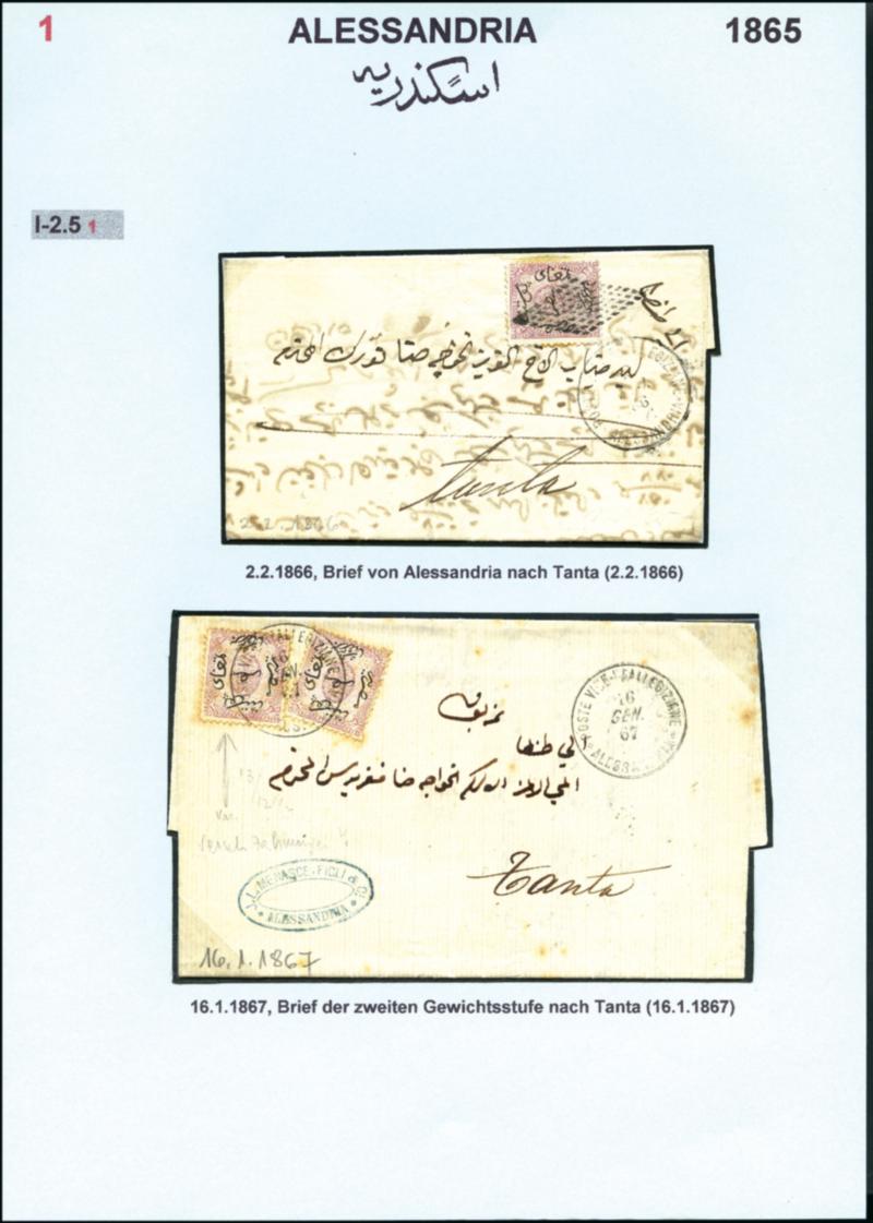 ALEXANDRIA: Specialized study collection extensively built up in over 30 years, neatly mounted and presented with much collateral information on 81 pages. The strength of this collection is in the range of different type cancels on stamps from 1866 to 1880, plus a fine array of interpostals and a valuable assembly of 45 covers, two newspapers etc. The collection includes the following cancels listed by Smith numbers: I-2 (in red on 1866 5pa + 1pi, in blue tying 2pi bisect on fragment, in red on cover franked 1866 1pi tied 'retta'), I-2.5 (9 stamps, 8 covers), II-2 (9 stamps, one cover), II-4 (14 stamps, 3 covers), III-2.5 (35 stamps incl. 1867 10pa mauve bisected on small fragment + on complete newspaper), IV-2.5 (5 in blue & black, 2 covers), IV-3 (2), V-1 (11, plus two tête-bêche pairs + 3 covers), V-1.5 (1), V-2.1 (3), V-2 (19, 6 covers + newspaper), V-2.2 (6, one cover), V-2.3 (2, 2 covers), VI-2.1 (7), VI-2.2 (9, one cover), VI-2 (16, one cover), VII-1 (3, 3 covers), VII-2 (2, 4 covers), Cas.1.5 (3 in blue, 13 in black & one postal receipt), Cas.2 (1), Cas.4 (3), Reg.-3 (2), Reg.-6 (1, 3 covers), Reg.-8 (one cover), Sta-3 (9), Sta-4 (6, one cover), Sta-6 (4, one cover), Sta-7 (5), Sta-8 (3, two covers), PS-7 (1), PS-10 (3), PS-11 (3), PS-12 (1), PS-15 (9), PRE-1 (39), SPO-1 (6), TPO-1 (3 covers), Duplex (58). Generally fine to v. fine strikes, an excellent opportunity for the student and a superb basis for expansion. (Image)