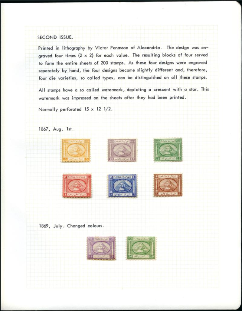 The Lars Alund balance collection of the Second Issues neatly mounted and knowledgeably written on 42 album pages, showing unused to 5pi, plus the a complete set of all values showing the four types, almost all unused, plus 5pa to 5pi with array of perforation varieties, shades, plate flaws including line across "1", flaw at column, double frame, broken "R"s, white flaws below Sphinx etc., mixed to very fine, an excellent basis for study and expansion (100's) (SG £11'000+). (Image)
