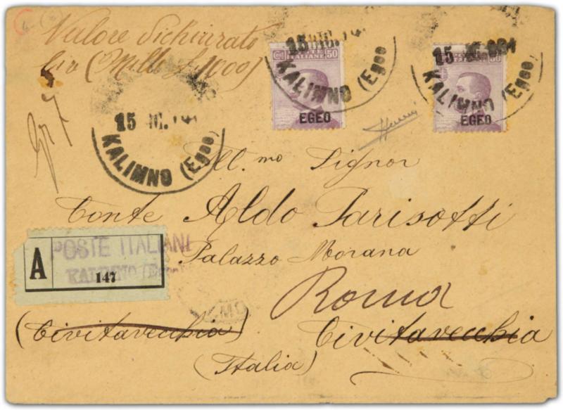 1912, declared value registered cover sent from Kalymnos to Roma/Italy bearing 2x 50 cent "EGEO" overprinted stamps tied by "KALYMNOS(Egeo)" postmarks, alongside very rare "A 147" registration label (Image)