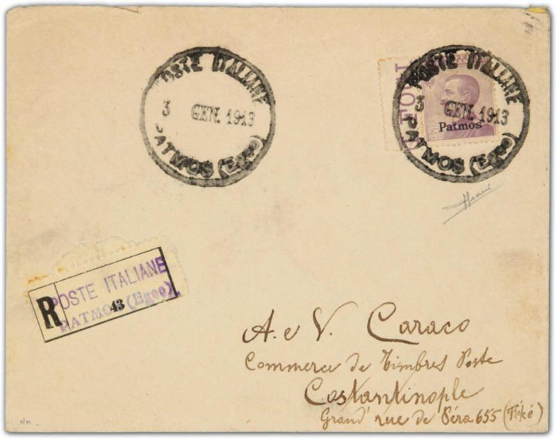 1913, single franking registered cover bearing 50 cent, "Patmos" overprinted tied by "POSTE ITALIANE PATMOS (Egeo)" postmark sent to Constantinople, alongside showing "R 43 POSTE ITALIANE PATMOS (EGEO)' registration label, on reverse arrival cds. (Image)