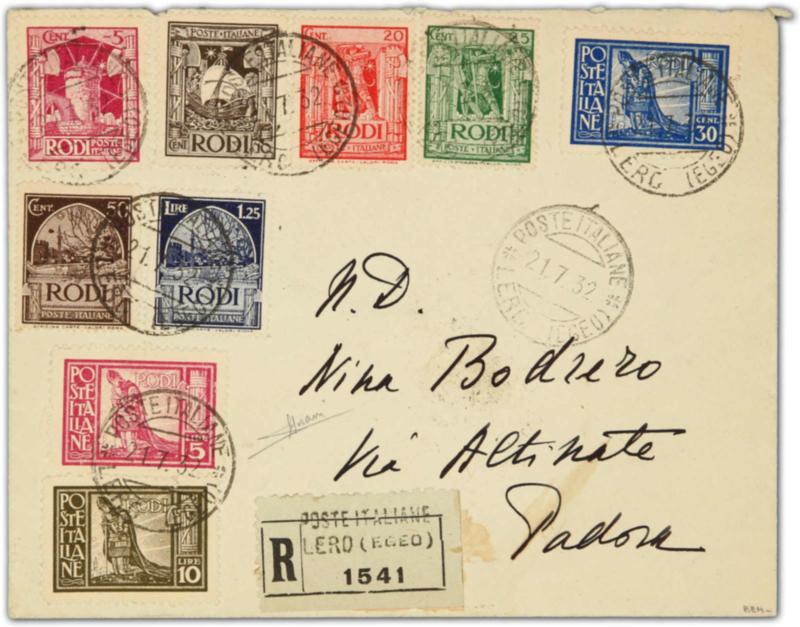 1929, pictorial issue, full set on registered cover sent from Lero to Padova all tied by "POSTE ITALIANE LERO (EGEO)" postmarks, on reverse several transit and arrival cds (Sassone 3800 €) (Image)