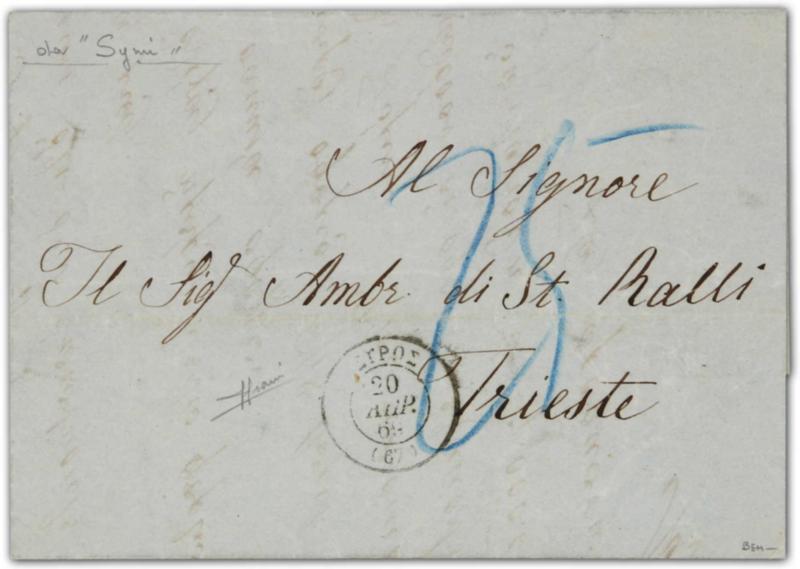 Symi Island Post office: 1869, entire letter sent from Symi to Triest via Syros Greek post office showing all Greek "Syros 20 Apr,69" cds, also 25 taxe by manuscript on front, on reverse showing Triest arrival cds, signed Sorani (Image)