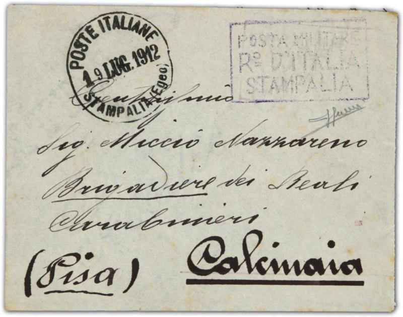 Stampalia, 1912, cover sent to Pisa/Italy showing "POSTE ITALIANE STAMPALIA (Egeo)" postmark and very rare large rectangle "POSTE MILITARE Ro. D'ITALIA STAMPALIA" post cachet (Tchilinghirian fig. 930), on reverse arrival cds, signed Sorani (Image)