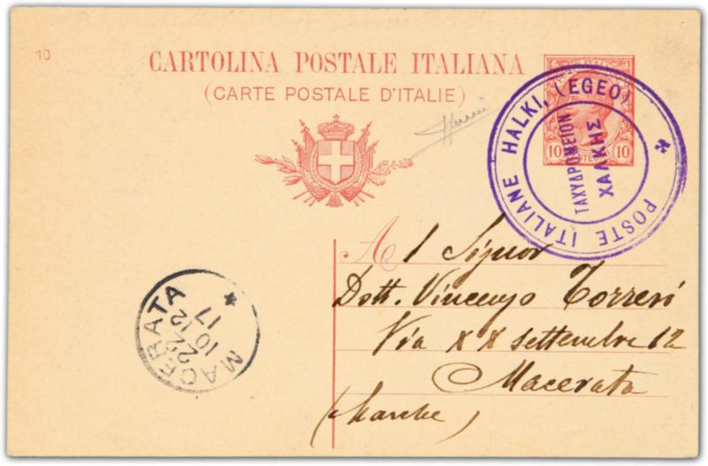 1912, Italian postal stationery card of 10 cent, sent from Halkı to Mecerata/Italy showing very rare and clear bilingual "POSTE ITALIANE HALKI (EGEO)" blue postmark, alongside arrival cds, certificate Sorani (Image)