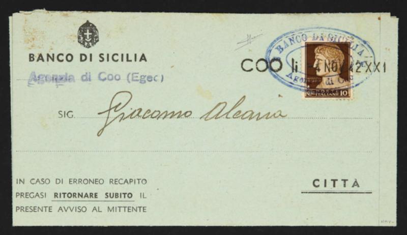 1942, bank formular entire locally used in Coo Island bearing single franking 10 cent. Italian stamp tied by triple-oval "BANCO DA SICILIA AGENZIA DI COO" cachet, signed Sorani (Image)