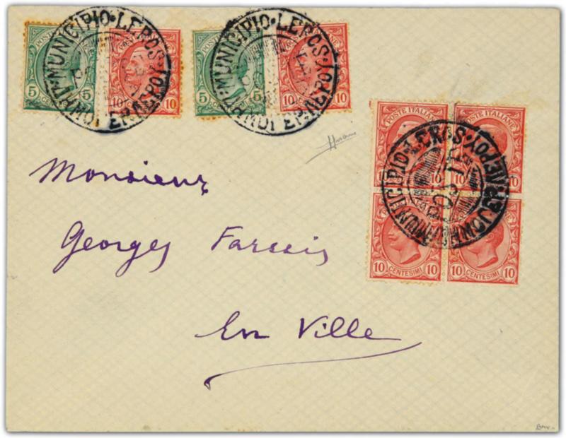 Leros, 1912, locally used cover bearing Italian stamps of Victor Emmanuel III, all tied by bilingual "MUNICIPIO LEROS POSTE" postmarks (Tchilingirian fig. 467) (Image)