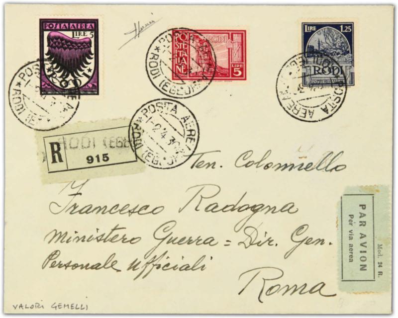 1936, registered cover bearing 5 Lire pictorial issue of 1932 issue and 5 lire of airmail issue of 1934 tied by Rodi Aerea postmarks sent to Roma with registration and "Par Avion" labels (Image)