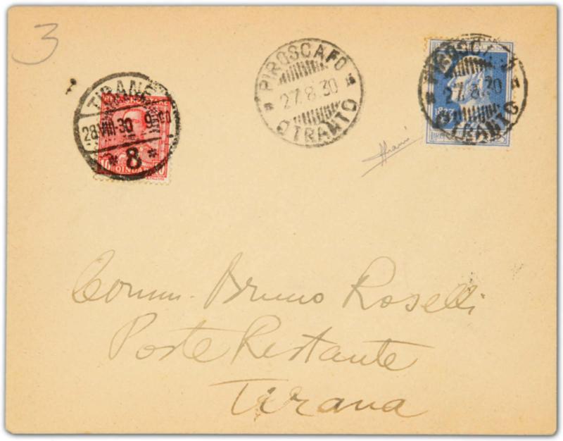 1930, poste restante cover sent from Italy by Volta 1.25 cent blue stamp tied by ship "PIRESCAFO/OTRANTO" cds to Tirane/Albania, the post restante fee collected by 10 qin, and tied by circular "TIRANE" cds, on reverse Durres transit and Tirane arrival cds (Image)