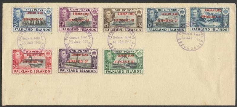 DEPENDENCIES: 1944-45 ½d blue-black & green SG A1a (a couple of toned perf tips) to 1/- tied to unaddressed cover by rubber '.../Graham Land/25JAN1945/...' cds, minor blemishes, Cat £1200+. RPSL Certificate (1989).