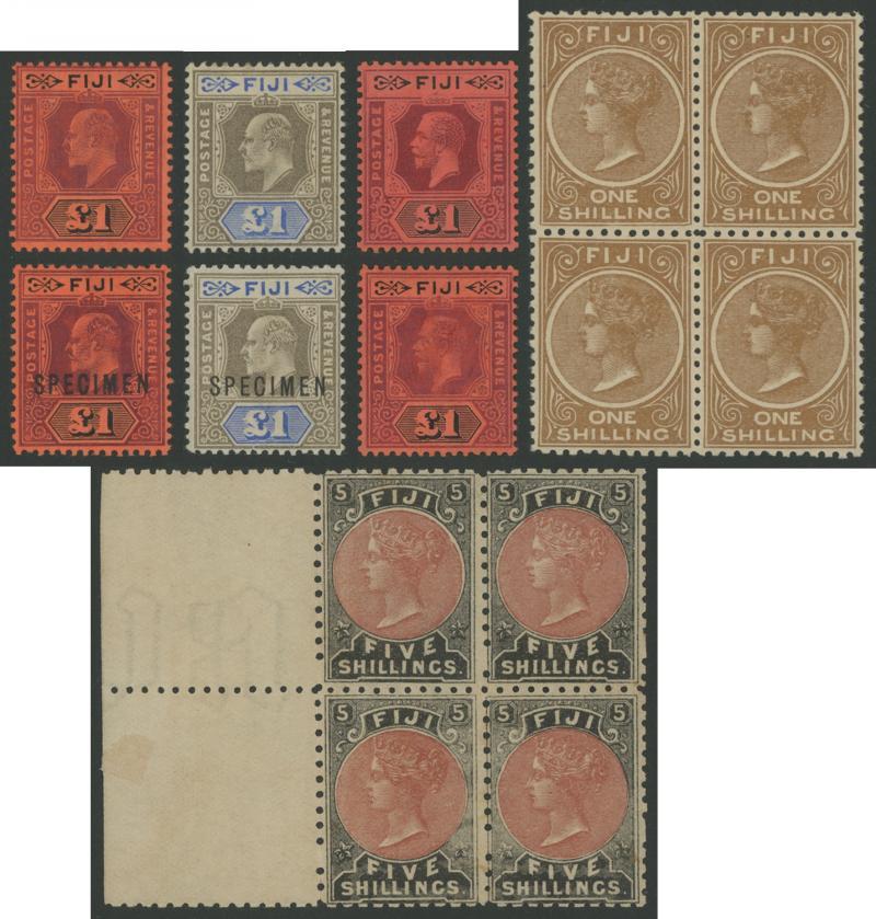 1878-1935 collection predominantly mint from Crown VR Perf 10 1d & 2d and QV 1/- brown x10 including a block of 4 ** in various perfs & shades and 5/- blocks of 4 x3 (one ** tropicalised gum, one CTO and one Imperforate also CTO), then a range of 1891-98 issues noted 2½d brown Perf 10 and Perf 11 x2, 1903 KEVII Keyplates set plus £1 overprinted 'SPECIMEN', 1904-09 MCA Wmk 1/- block of 4 */** and 1906-12 New Colours 5/- and £1 purple & black/red plus 'SPECIMEN' overprints 5/- x2 & £1, 1912-23 KGV Keyplates MCA Wmk 2/6d 5/- and £1 purple & black/red Die I & Die II plus 'SPECIMEN' overprints set (ex ½d & 5d; 1d faulty), 1922-27 KGV Script CA Wmk set plus 'SPECIMEN' overprints set with a range of extra shades, 1935 Silver Jubilee set plus 1½d aniline red shade in blocks of 4 ** and punctured 'SPECIMEN' set *, some light gum tropicalisation or minor blemishes but generaly fine to very fine, Cat £4300+.