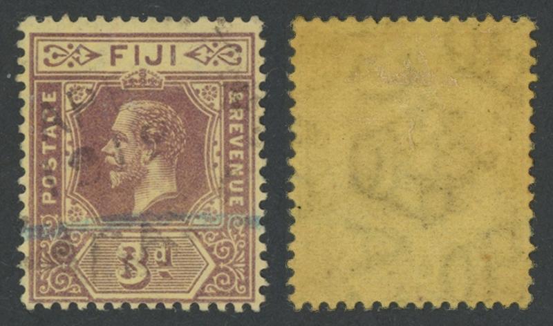1912-23 KGV Keyplates Multiple Crown CA Watermark 3d purple/yellow with the Watermark Sideways SG 130a, light 1918 cds cancel & blue pencil line from use on a registered article, Cat £550. (Image1)