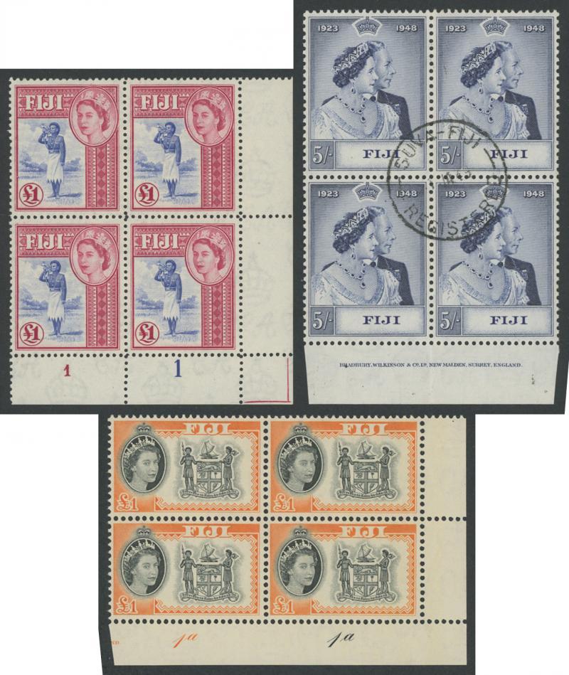 Mostly QEII collection including 1948 Wedding 5/- blocks of 4 ** x2 (one Plate 1) and Bradbury Wilkinson Imprint block CTO, 1954-59 Pictorials set used/CTO and in Plate Number corner blocks of 4 **, 1959-63 Pictorials set used/CTO and in corner blocks of 4 ** (ex 2/6d & 10/-; most with Plate Numbers), 1962-67 Block Wmk set in Plate Number corner blocks of 4 **, plus blocks & larger multiples of other issues to 1968, condition generally fine to very fine, Cat £1200+.