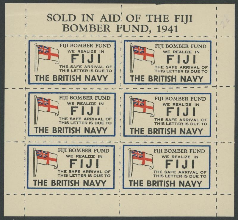 CINDERELLAS: 1941 'FIJI BOMBER FUND/...' label complete sheetlet of 6 (2x3) with inscription in the top margin, minor crease in the top margin only otherwise superb unmounted. The finest of the few sheetlets we have seen. A sheetlet with five units unmounted sold at our auction of 20.1.2007 for $728 (Sale 125 Lot 858). (Image1)