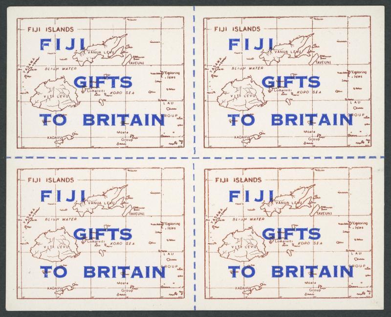 CINDERELLAS: 1946 'FIJI/GIFTS/TO BRITAIN' label complete sheetlet of 4, unmounted. Superb. Despite being much scarcer than the Bomber Fund labels, the only similar sheetlet we have offered - minor blemishes - sold at our auction of 20.1.2007 for $233 (Sale 125 Lot 860). (Image1)