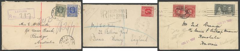 Pre-WWII mostly commercial covers including 1895 front to NSW, early Postal Cards to Germany x2, France or Isle of Wight (message headed "HMS Pylades Suva" refers to a cricket match - "We got horribly beaten" - carried per Naval Bag & cancelled at London, corner fault), a few registered including two from Levuka (one commercial to Victoria) and 1914 to Surrey paid 1d only but not taxed, destinations include Hawaii x2 (one taxed with US postage dues), Canada, Belgium, Tasmania and British Guiana, a few Paquebot items including 1923 advertising cover from Auckland to Canada with NZ stamps tied by 'GPO SUVA' cds (stained), etc, postmarks include commercial covers with 'MAKOGAI' (apparently from a missionary at the leper colony), 'PO NADI', 'NAUSORI PO', 'PO NAUSORI' and 'SAVU SAVU EAST', a few problems but generally fine to very fine.