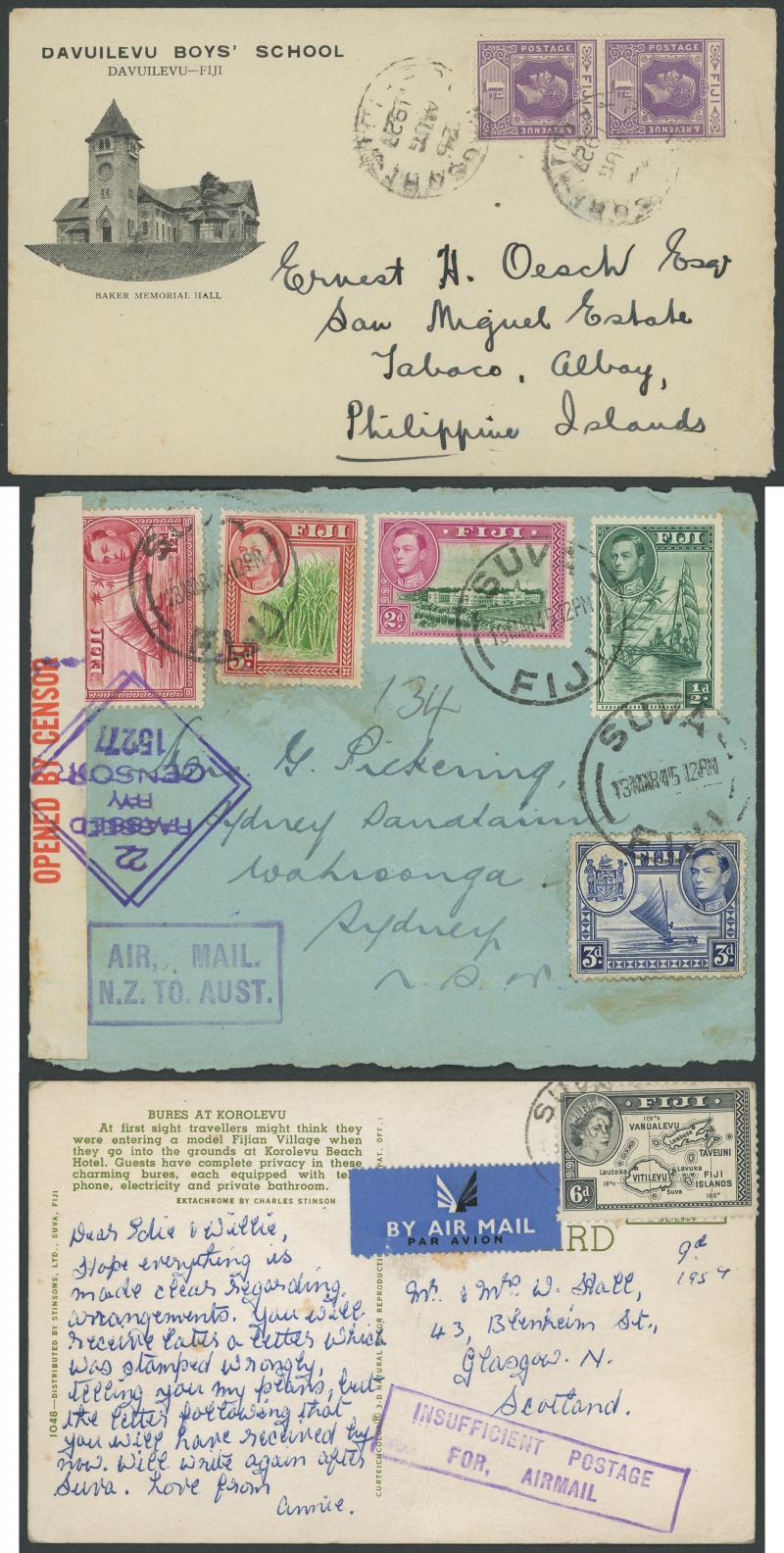 1907-1950s covers including a few KEVII PPCs, 1914 PPC to Germany with 'UNDELIVERABLE/LPS' cachet of London, 1924 to Kenya with KGV ¼d strip of 4 & ½d pair, 1927 registered with 'P.O. WAIYEVO' cds on huge R label, 1937 Canton Island to Ocean Island cancelled with Suva cds & boxed 'PAQUEBOT' handstamp, a few advertising covers including lovely 1927 illustrated for Davuilevu Boys School, 1941 to NSW with 'FIJI BOMBER FUND/...' label (faults), 1945 airmail front to NSW with boxed 'AIR, MAIL./N.Z. TO. AUST.' and 1960 PPC to GB paid 6d only with boxed 'INSUFFICIENT POSTAGE/FOR, AIRMAIL' cachet, and a few others, generally fine to very fine. A very good lot.