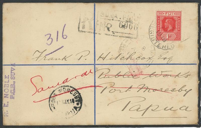 1918 (Apr 8) commercial usage of KGV 1d+3d size G Registration Envelope to "Public Works/Port Moresby/Papua" with KGV 1d tied to the face by light Suva cds, Sydney transit cds of 22AP18 and 'PORT MORESBY/12MAY18/PAPUA' arrival where redirected to "Samarai", minor blemishes. Very scarce origin/destination item. The additional 1d was for the War Tax that applied 1.12.1915 to 30.6.1920. It was not required to use the 'WAR TAX' stamps. (Image1)