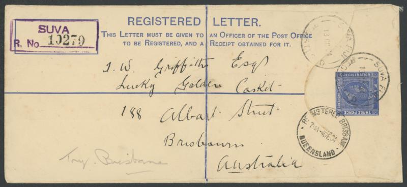1934 commercial usage of Long Format KGV 2d+3d blue Registration Envelope to the "Lucky Golden Casket" lottery in "Brisbourn" & endorsed "Try Brisbane", 'SUVA FIJI/13OC34/REGISTERED' cds & superb rubber R cachet in violet, very fine 'REGISTERED BRISBANE/4DE34/QUEENSLAND' arrival cds on the face, vertical fold along the central blue line. 22 days transit to Queensland is excessive. The endorsement indicates that the envelope was first missent, probably to Melbourne. (Image1)