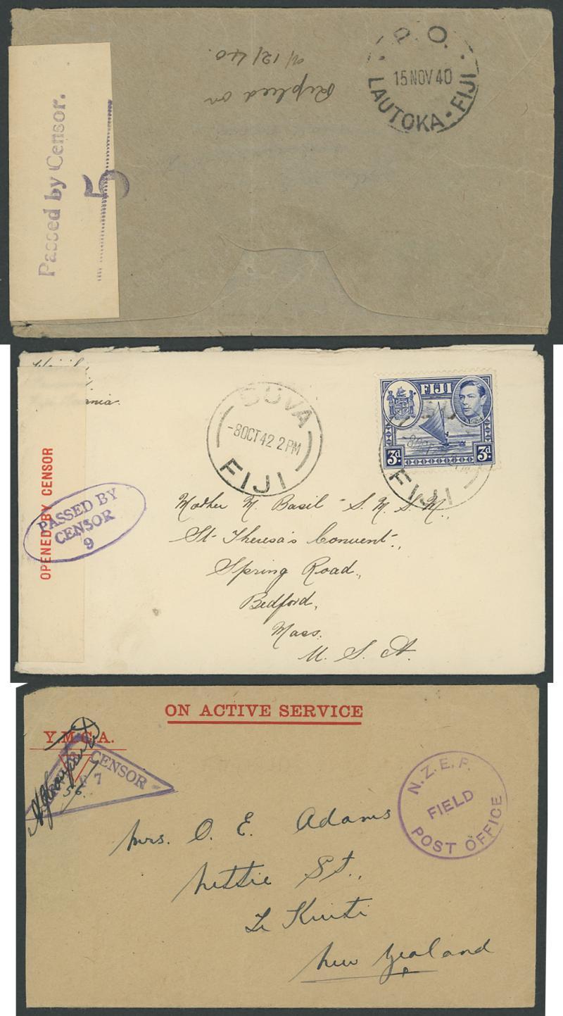 1940-45 WWII civil censorship group with Fijian cachets 'Passed by Censor/....' with no number & with '5' or '8' added, 'PASSED BY CENSOR/ 3 '-in oval & similar '8' & '9', and black/white labels 'EXAMINED BY/ 1604 ' and similar '2626' & '3085', 'OPENED BY EXAMINER/ X 111 ' and similar '112' '113' '114' '115' '116' '117' '118' and '119', and 'EXAMINED BY/USA 2647', plus stampless NZ Forces covers with very scarce 'SERVICE CENSOR/ F6 ' in blue or similar 'F7' in violet used by Fijian Forces. Challenging group to assemble. [See also Lot 313144]