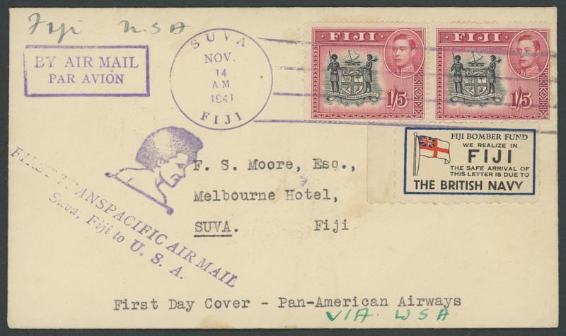 1941 PanAm first flight cover to USA with 1/5d pair tied by 'SUVA/FIJI' roller in violet which also just ties a very fine 'FIJI BOMBER FUND/...' label, superb 'SAN PEDRO/NOV/17/1941/CALIF' arrival backstamp. (Image1)