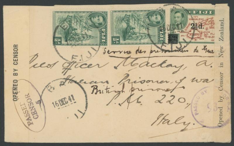 1941 (Dec 16) to "Pilot Officer Mackay A, Italian Prisoner of War, PU 220, Italy" with KGVI Pictorials ½d x2 & '2½d' overprint on 2d Map tied by 'BA/FIJI' cds, address endorsed "Service des Prisonniers de Guerre, British Prisoner", censored locally with resealing tape at left tied by 'PASSED BY/CENSOR/5' oval handstamp and again in transit in New Zealand with resealing tape at right tied by 'PASSED BY CENSOR/93' cachet, light central fold & minor blemishes. (Image1)