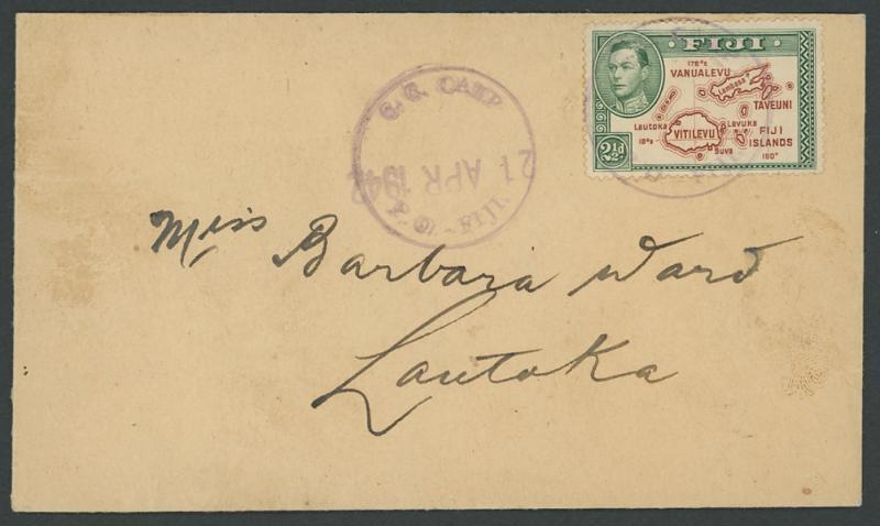 1942 social cover to Lautoka with 2½d Map tied by one of two strikes of the very scarce 'C.C. CAMP/P.O. - FIJI.' cds with separate '21APR1942' dater (inverted) both in violet, superb 'P.O. LAUTOKA/22/APR/1042/FIJI' arrival backstamp. PO 2/1/1942; closed 31/5/1942. [A New Zealand Civil Construction Unit was based here during the construction of Nadi Airport] (Image1)