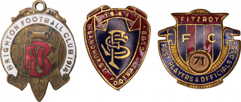 Balance of collection 'Football Records' (4) including 1964 Grand Final Melb v Coll & 1970 Royal Visit; 1950s Tasmania Records; 1968 Kevin Murray testimonial menu with 37 signatures; 1971 Premiers medal; badges (27) including Brighton FC 1914, circa 1920 J O'Keefe West Adelaide, Sandhurst FC 1951, West Heidelberg FC 1952, Kennington FC 1954, Golden Square FC 1956, Subiaco FC 1961, Fitzroy Past Players 1971, WANFL Members Club; fixtures (5); Carlton annual reports 1970 & 1972; covers (14); James Boag football jumper, mainly Fair/Fine condition. (Image1)
