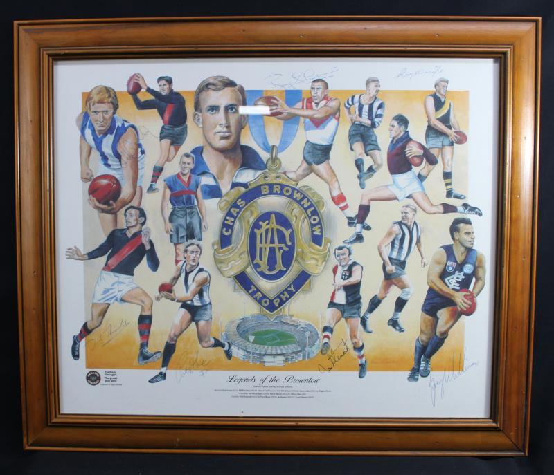 Brownlow Medallists & Champions signed football cards (26) & pieces (4), including Dick Reynolds, Don Cordner, Allan Ruthven, Kevin Murray, Bob Pratt & Bobby Skilton; plus framed print 'Legends of the Brownlow', mainly Fair/Fine.