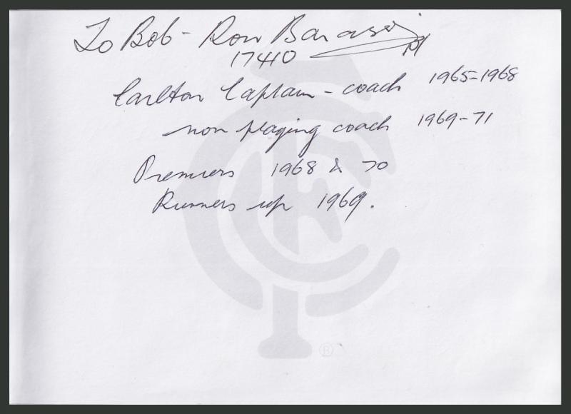 Balance of collection noted 72 items with 249 autographs including Ron Barassi, Barry Breen, Alex Jesaulenko, Kevin Sheedy, Roger Dean, Syd Jackson & Bob Davis; reprinted team photographs (21 - 12 with a few signatures) noted Carlton 1945 & 2nd 18 1948 & 1949; Melbourne 1946 (3), 1948 (2) & circa 1959; Richmond 2nd 18 1939, 1942, 1944, 1947 (2), 1949 & 1950; South Melbourne 1945; Victoria 1949 (2) & 1950, Ovens & Murray 1970; Premiership Players Club Trophy awarded to Stan Rule (Melbourne 1948); St Kilda mirror; 1974 Grand Final souvenir; tickets (27) funeral booklets (7); ephemera, mainly Fine.