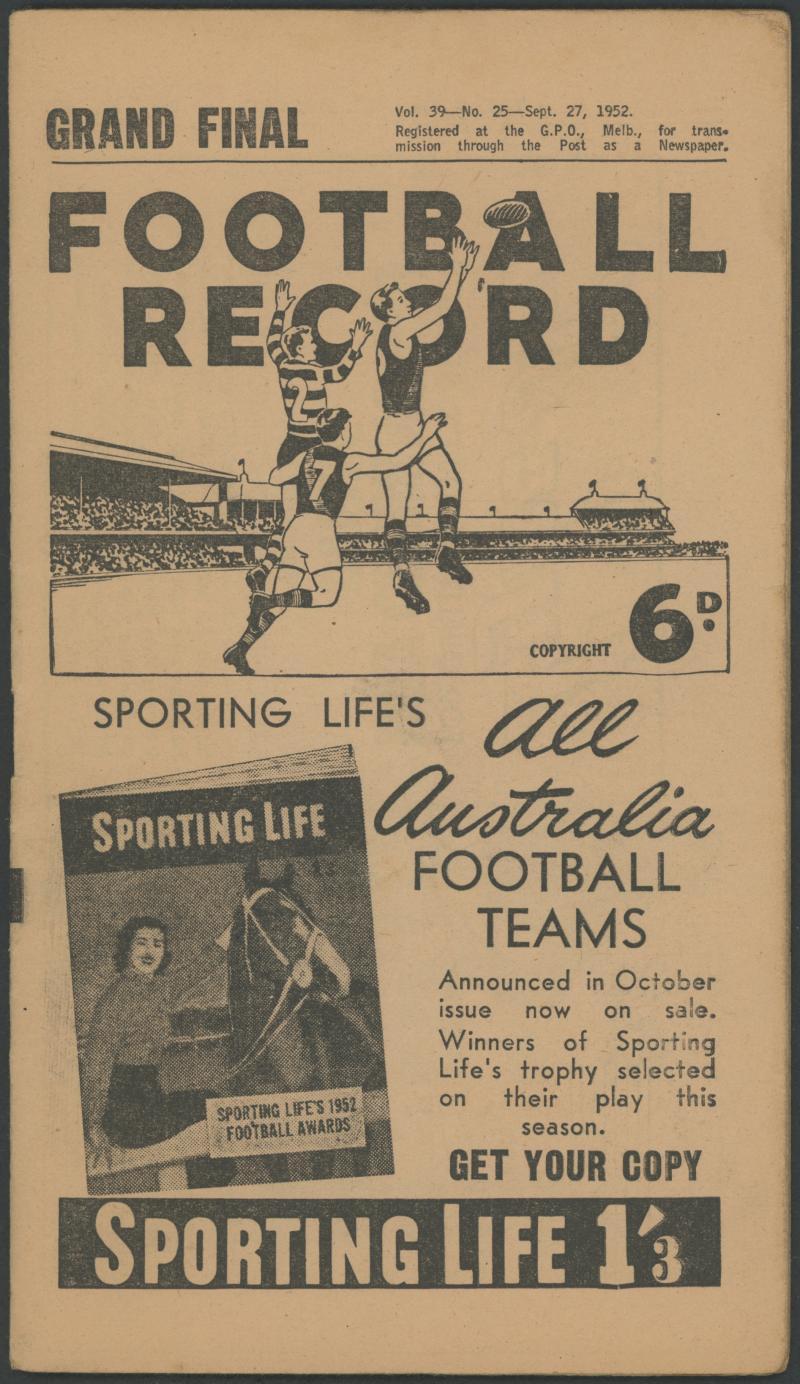 Records 1946-1970 collection including Grand Finals 1952 Geel v Coll, 1956 Melb v Coll, 1958 Coll v Melb, 1965 Ess v StK, 1966 StK v Coll (cover damaged); also 1937-38 'VFA Recorder' (3) including 1938 Grand Final Brunswick v Brighton, mainly Fair/Fine.