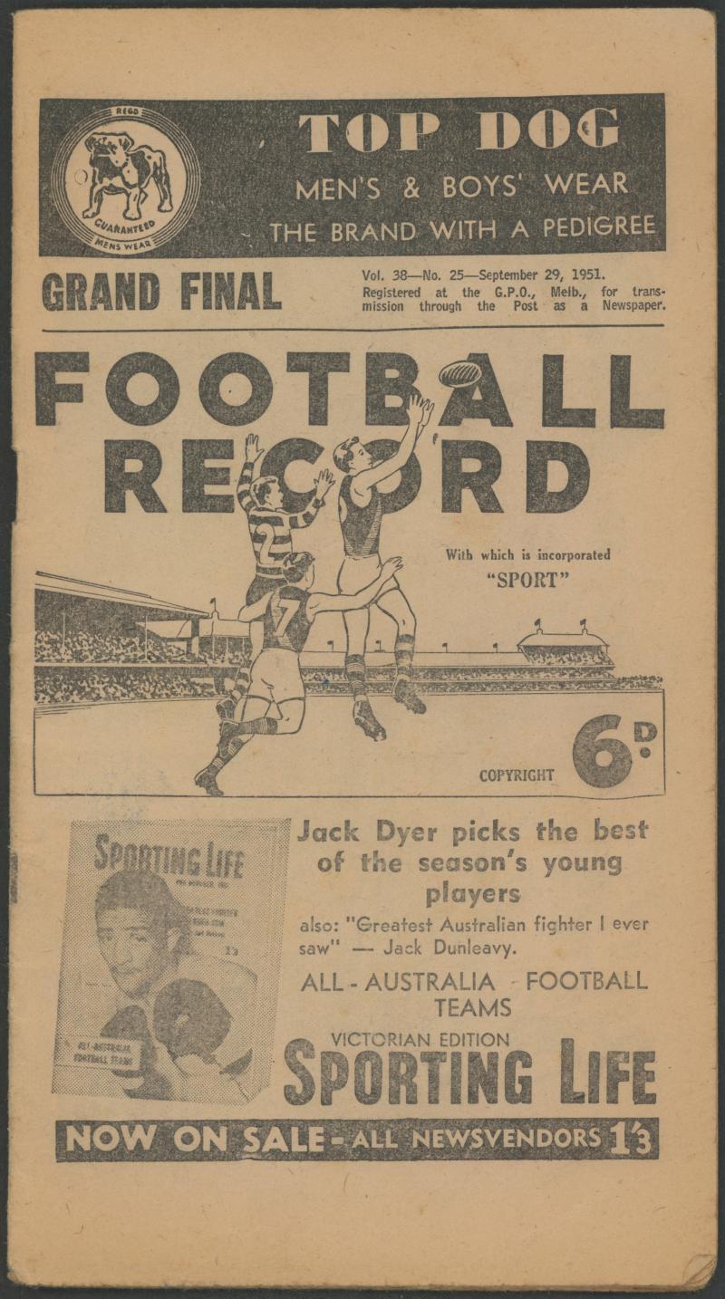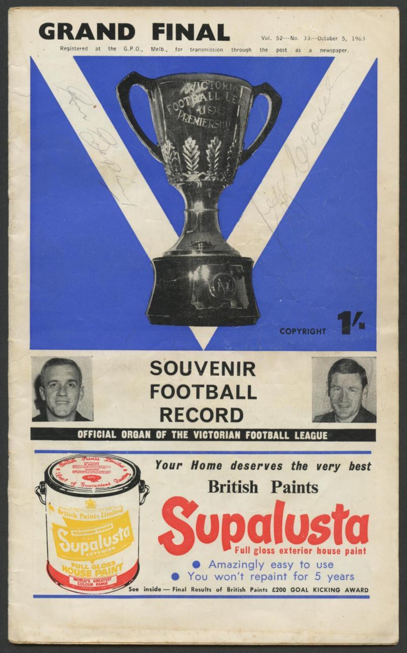 Records & Magazines 1968-2005 collection of 'Football Records' with home & away (210+), Finals, (30), Grand Finals (15) & others (14); other programmes with SANFL Grand Final, WAFL Grand Final, VFA/VFL (4), Mornington Peninsula Nepean League (70), VSFL (7), others (7); magazines (30), various annual reports (14), year books (11), books (7), fixtures (15), autographs (5) including Kevin Bartlett, ephemera (6); Herald-Sun 'Footy' supplements (100+), newspapers including Grand Final supplements, mainly Fair/Fine.