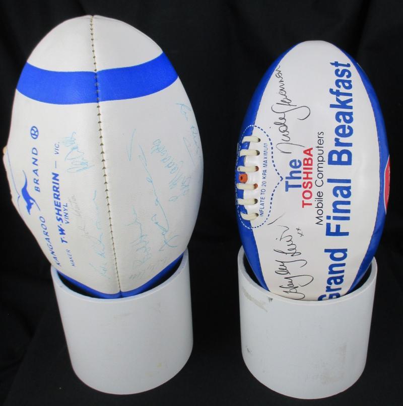 Signed footballs comprising NM Grand Final Breakfast with 13 signatures including Gough Whitlam, Paul Keating, Keith Greig & Lou Richards; 1995 GF Breakfst signed Hayley Lewis & Nicole Stevenson; 1996 GF Breakffast with 12 sigs including Todd Woodbridge & Kieren Perkins; 1999 GF Breakfast signed Nova Peris-Kneebone; 2000 GF Breakfast with 3 sigs including Paul Roos; 'Lyrebird' with 17 signatures including Bernie Quinlan; 'Ross Faulkner' with 7 sigs including Rex Hunt & Robert Walls; 3AW mini-football signed Ted Whitten, mainly Fair/Fine condition.