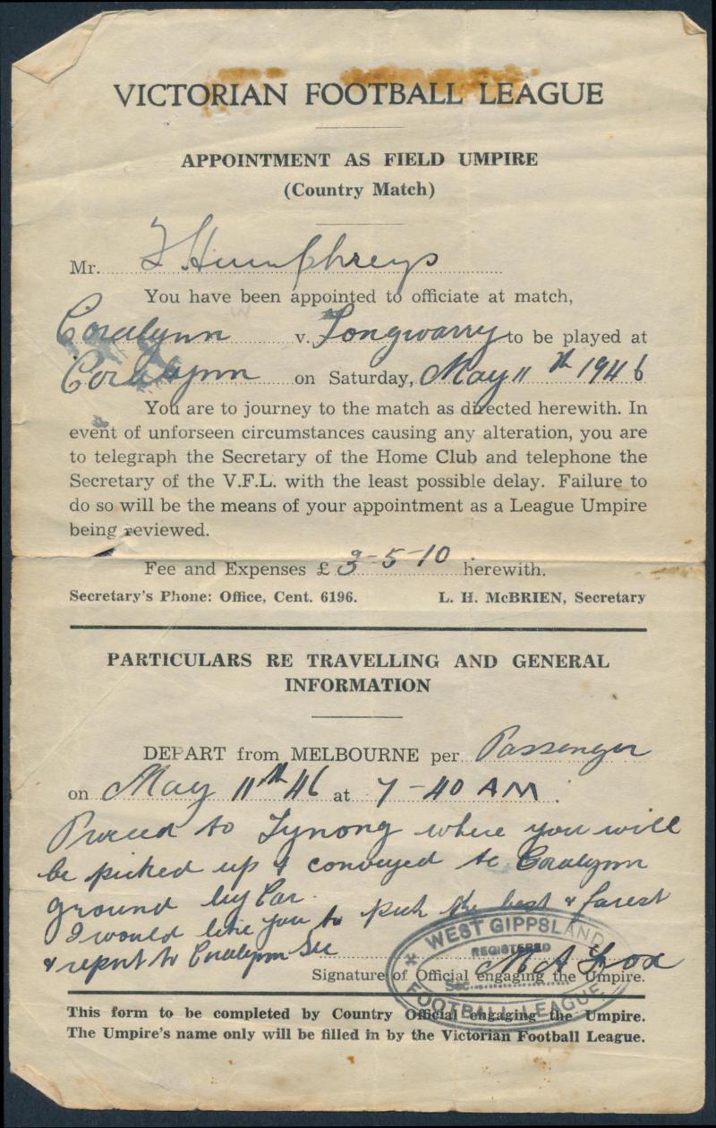 Umpires 'Victorian Football League, Appointment of a Field Umpire' forms 1946-1959 directing Mr Humphreys to umpire matches all over Victoria & Southern NSW by train, car, bus & tram (includes one in Tasmania by air), Fair/Fine condition. Fascinating group. Did he umpire a match featuring your club?